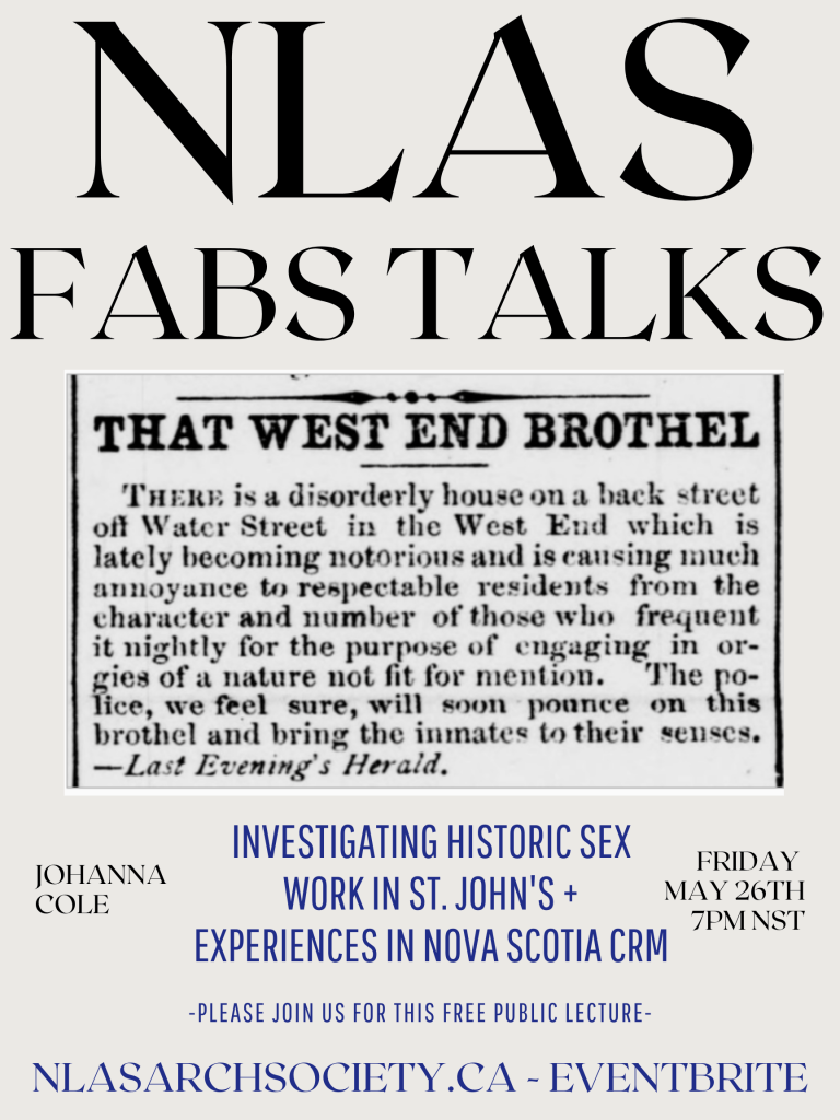 Welcome back everyone! We’re slowly putting our events together for the rest of the year, and are happy to have MUNL Alumni Johanna Cole joining us over Zoom for our first 2023 FABS talk, titled “Historic Sex Work in St. John’s + Experiences in Nova Scotia CRM”.