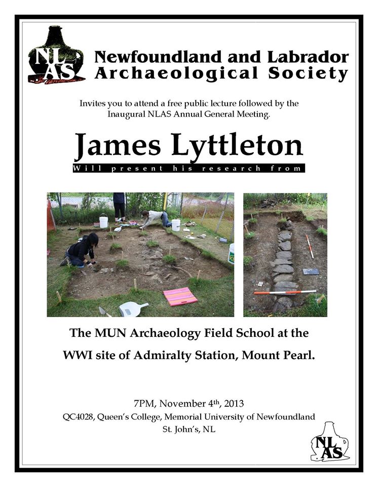 Dr. James Lyttleton was the guest presenter who spoke at the first NLAS Annual General Meeting on November 4th, 2013. Dr. Lyttleton spoke about the MUN Archaeology Field School that he directed at Admiralty Station in Mount Pearl that summer.